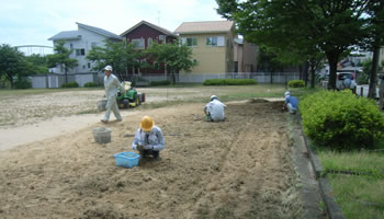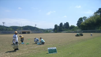 ◆多目的グランドにて芝生の更新作業前の手抜き除草、石拾い作業