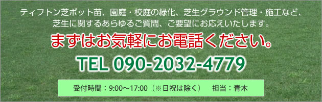ティフトン芝ポット苗、園庭・校庭の緑化、芝生グラウンドの管理・施工、その他芝生に関するお問い合わせ、お見積もりは下記連絡先まで、またはフォームよりお気軽にお問い合わせください。