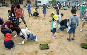 芝生を植え、育てることを授業の中に取り入れることができます。草の種類、見分け方育て方は良い教材になります。