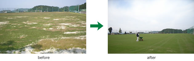 土やコンクリートに比べ夏季日中の芝生の表面温度は概ね10℃位まで(ある研究所の調査によると芝生とダスト舗装の校庭では、8℃の差があるとの結果)低くなります。照り返しも少なくヒートアイランド現象の緩和にも役立ちます。